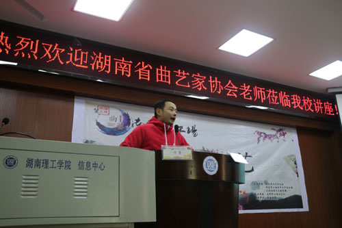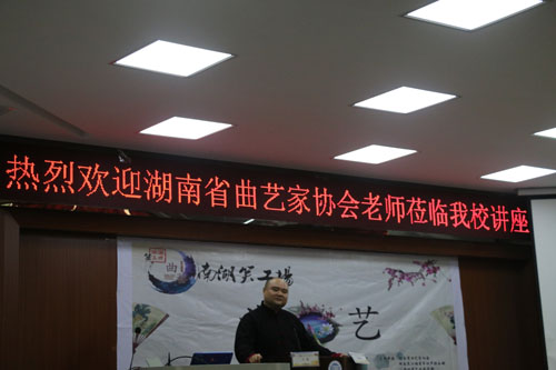 校园网讯11月27日下午,湖南曲艺家协会副主席刁子,湖南省曲艺家协会曲艺专干、非物质文化遗产传承人胡聪俊老师,湖南本土笑星“蠢得死”黄荣老师、湖南笑工场青年相声俱乐部李丹老师等一行8人在6栋学术报告厅进行了一场幽默风趣的曲艺学术报告讲座。