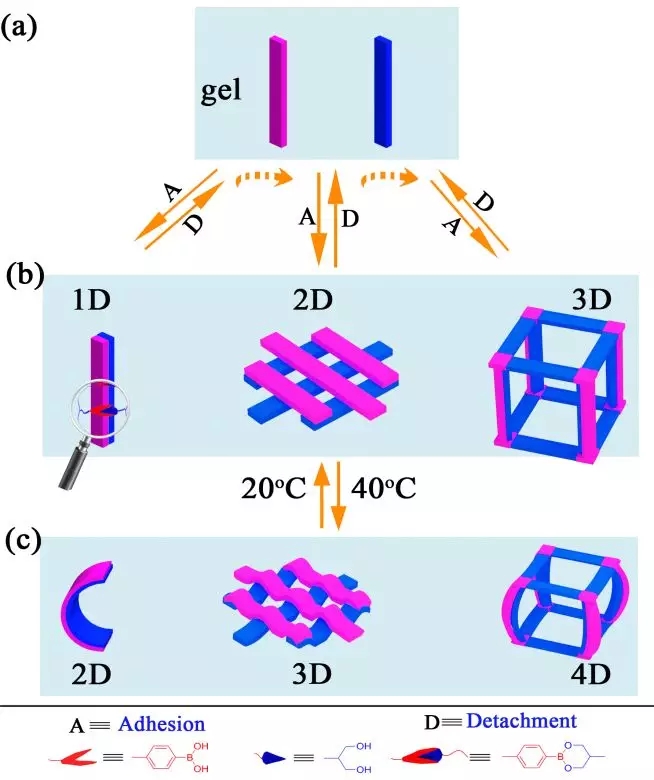 越来越多的证据表明,材料的功能受到其形状和尺寸的显著影响。据报道圆盘状种植体比球形种植体具有更高的酶活性和细胞反应。而水凝胶是一种具有强大渗透力的物质,被视为细胞的理想繁衍地,在生物医学及组织工程中具有广泛的应用。因此,构建形状和尺寸可控的3D水凝胶结构在工程和生物医学领域具有重要意义。尽管已有很多关于构建三维水凝胶的研究,但三维结构一旦成形很难再分离,限制了此类智能水凝胶的循环利用,仍然缺少一种简单、便捷、可逆的构建三维水凝胶结构的方法。