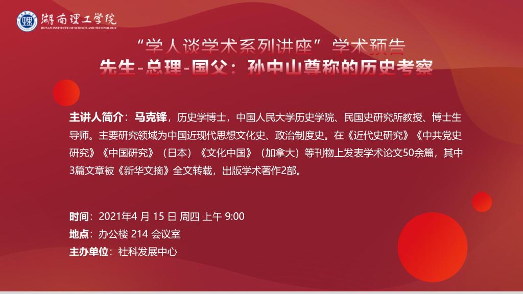 主题:“学人谈学术系列讲座”学术预告:孙中山尊称的历史考察