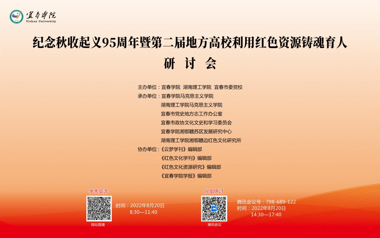 校园网讯为了纪念秋收起义爆发95周年,探讨开发和利用地方红色资源进行大学生思想政治教育,加强地方高校之间合作,8月20日,我校联合宜春学院、宜春市委党校主办了主题为“纪念秋收起义95周年暨第二届地方高校利用红色资源铸魂育人”的学术研讨会。大会以线上线下相结合的方式进行,线下会场设在宜春学院。
