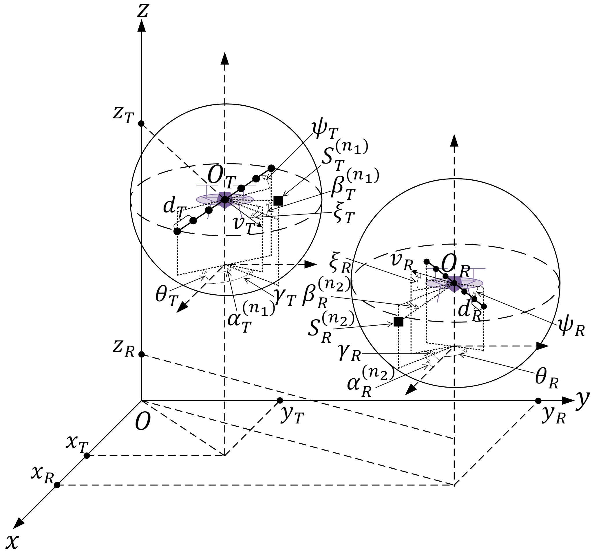 无人机空对空通信在提升未来通信网络的覆盖面和可靠性上具备潜在的应用价值,近年来受到学界的广泛关注。为了研究无人机空对空通信的信道特性及容量,论文作者在之前的工作中提出了三维任意俯仰双圆柱几何随机信道模型,并基于该模型推导了空时相关函数的一个近似闭式表达式(DOI:10.1109/JIOT.2023.3325945)。尽管圆柱面适用于建筑、路灯等具有竖直表面的散射物的建模,这些人工建造的物体主要分布于城区和近郊区域,在山区、田野等地区中较为少见。然而,无人机空对空通信常被应用于非城区场景下(如救援和监测任务),这表明双圆柱模型在无人机空对空信道建模中有一定局限性。为了更加真实、有效地建模各类场景下的无人机空对空信道,论文建立了一个任意俯仰双圆球几何随机模型,如图1所示。