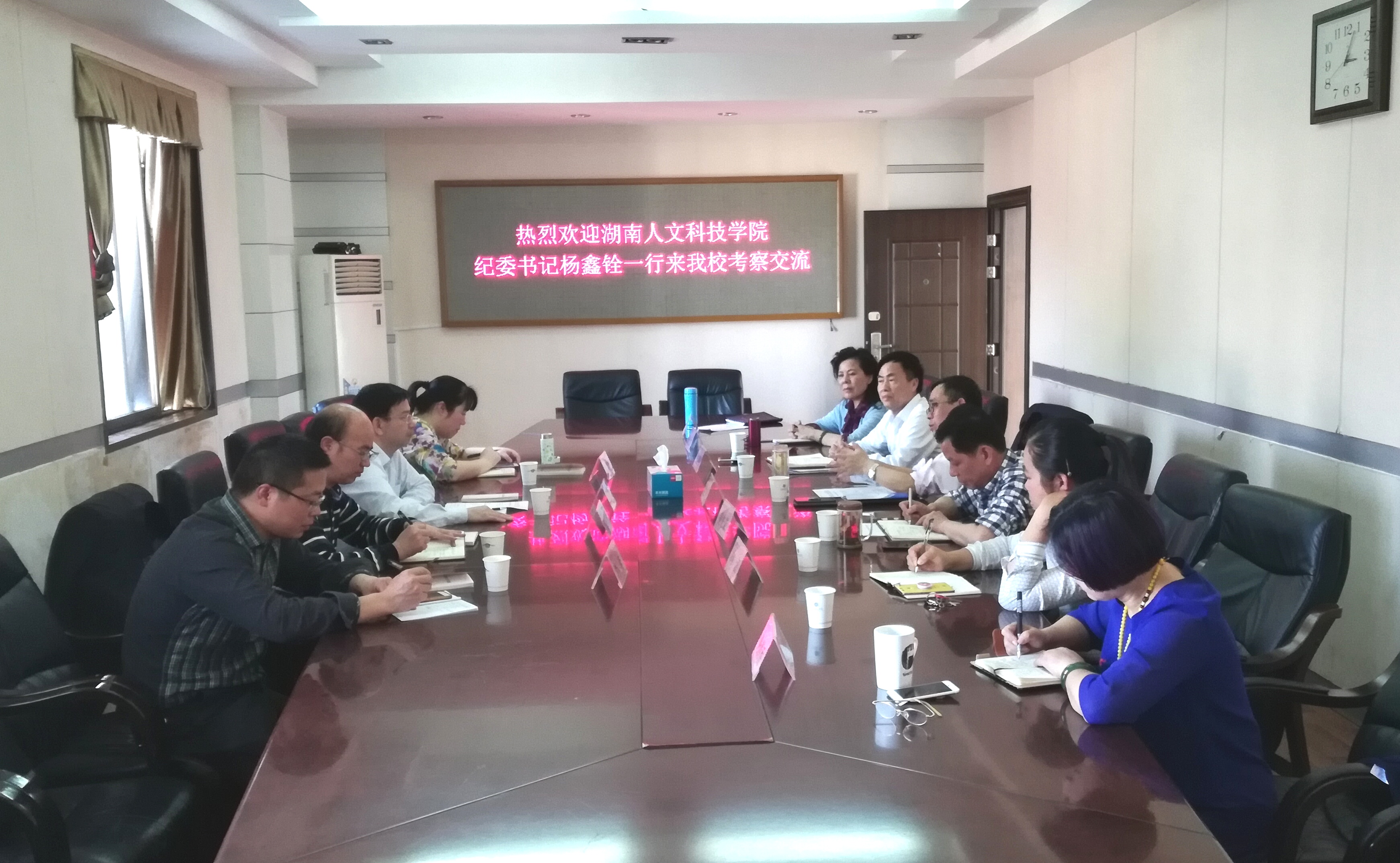 4月19日下午,湖南人文科技学院党委委员、纪委书记杨鑫铨一行来我校考察交流,校纪委书记谢贵辉在办公楼414会议室热情接待了客人。