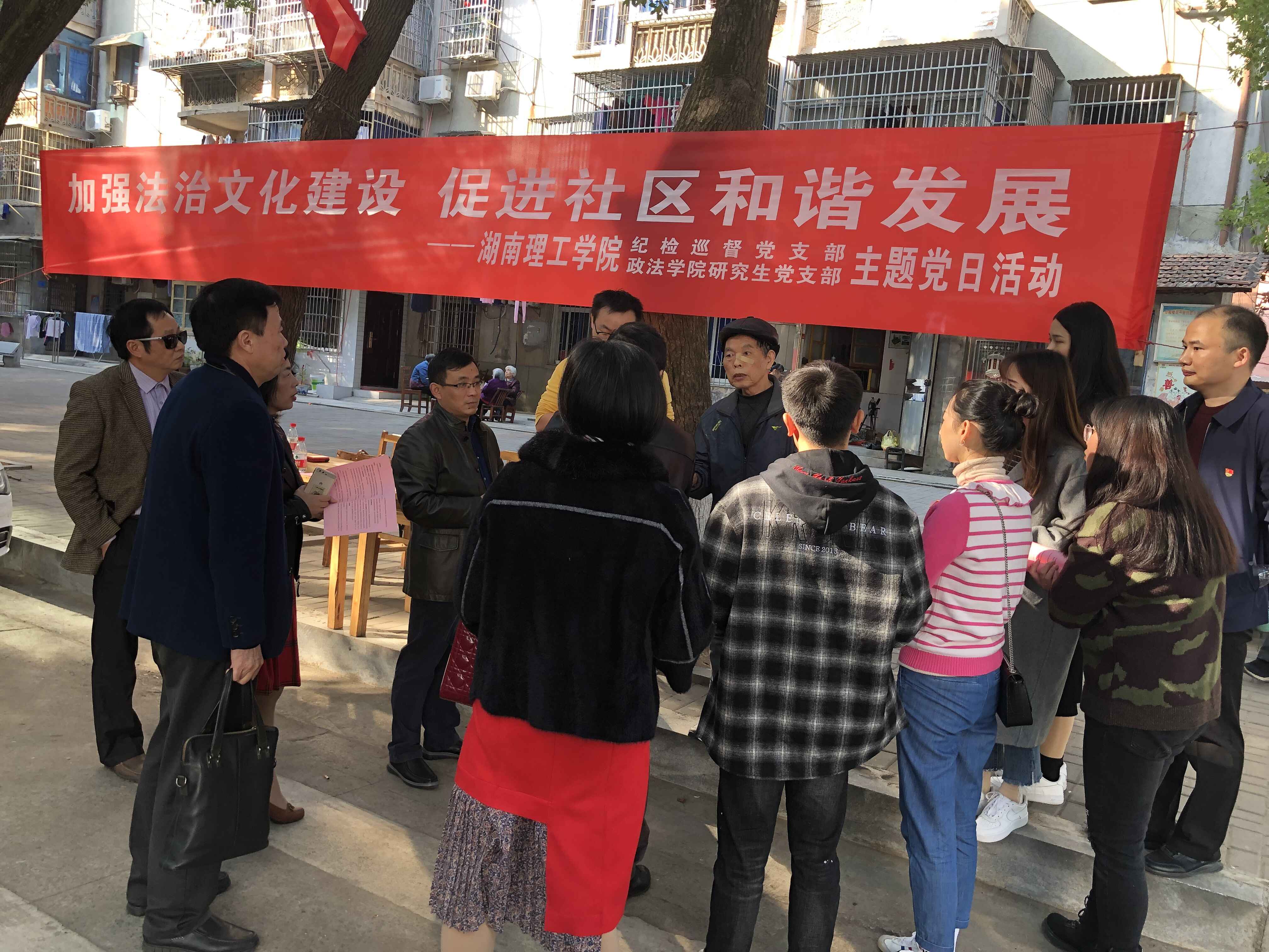 11月22日下午,为进一步推进党建“牵手工程”、做好“七进两联系”工作。新利在线注册机关纪检巡督党支部牵手政法学院研究生党支部,深入岳阳楼区奇家岭街道办事处学院路社区开展“加强法治文化建设、促进社区和谐发展”的主题党日活动,学校党委委员、纪委书记谢贵辉和支部全体师生一同参加了此次活动。