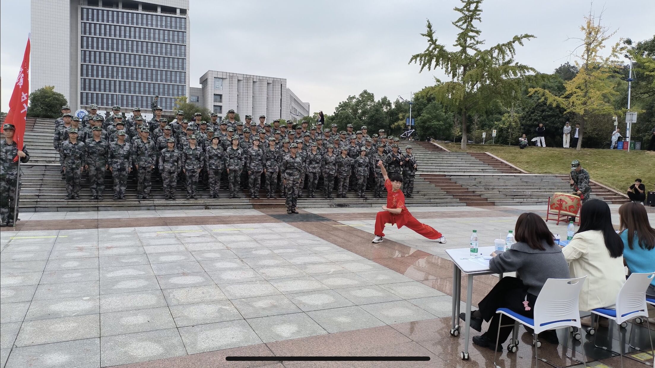 “假如今天战争爆发,磨砺意志的铠甲,压满智慧的弹匣,人未出发,心已到达”。一首《假如战争今天爆发》,以嘹亮歌声唱出了自强不息的精神、忠贞爱国的信念与强国有我的自信。表演中穿插了打鼓、武术等表演形式。